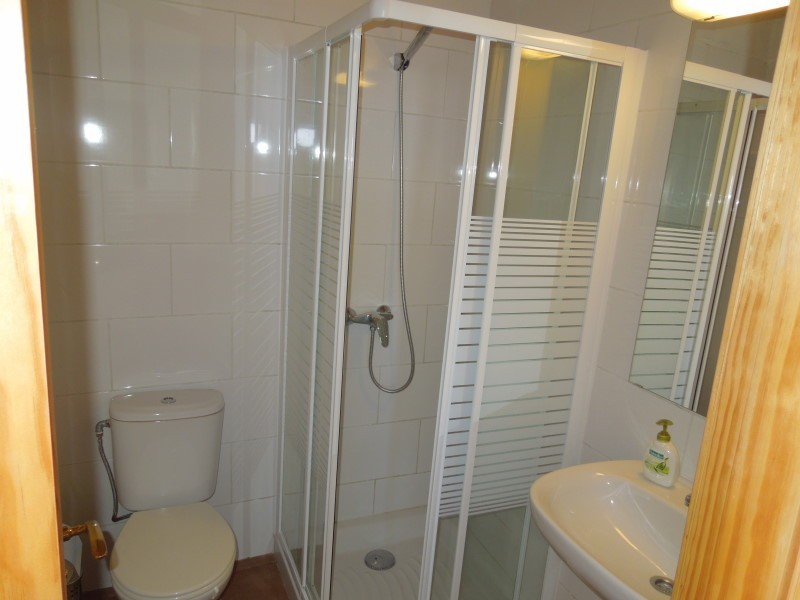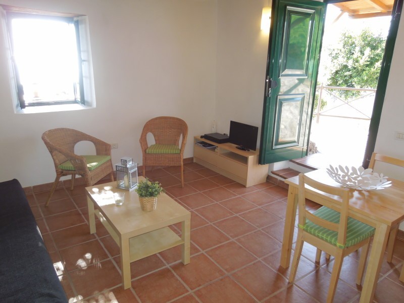 Das kleine Haus hat alle Räume in einem Zimmer: die Küche mit einer Arbeitsplatte aus Granit und allen Elektrogeräten, das Wohnzimmer mit Flachbild-Fernseher (und Satelliten-Fernsehen) und das gemütliche Sofa, das sich mit wenigen Handgriffen zum Schlaf-Sofa (1,50 x 2,00 m) umbauen läßt. Außerdem gibt es eine Esszimmerecke.