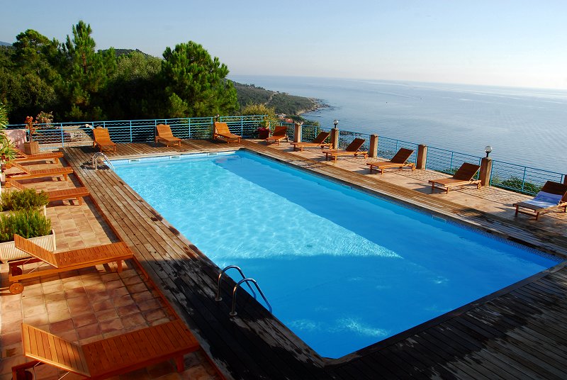 Auf dem Gelände unserer Siedlung befindet sich, direkt an einem kleinen Eichenwald gelegen, ein nur unseren Gästen zugänglicher Panoramaswimmingpool, von wo aus Sie einen wunderbaren Blick über das Meer haben.