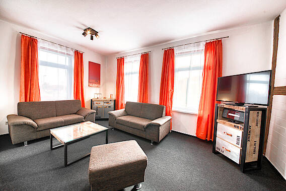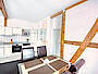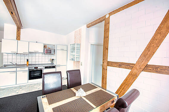 - gemütlicher Wohnraum mit viel erhaltenem originalen Fachwerk, Couchen und Esstisch für 4 und Einbauküche mit Backofen, gesamt ca. 30 m²